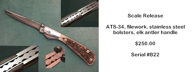 Click on pictures to see detail information and larger images.Scale Release #B34 This kind of knife will close by moving the back of the handle. Best of both worlds: Strength of a lockback with the ease of one handed use.