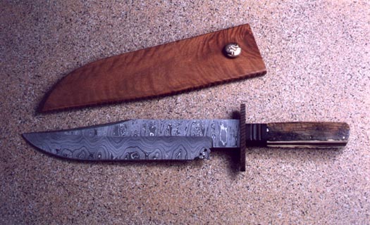 Bowie 1095/Nickel Damascus Blade, Overall Length 16 1/2", Browned Steel fittings , Mastadon Ivory Handles, Keri wood Sheath w/Mokume button, $595.00