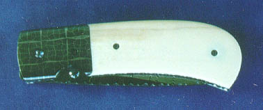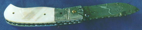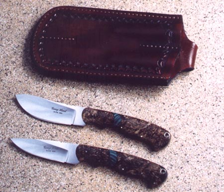 Guide Series caper, ATS-34 Blade RC61, Mother of Pearl handle, fully file worked along spine. $295.00 User Friendly Set, ATS-34 Blades, RC61, Mokume Gane Bolsters, Pink Ivory Handles, "Piggy Back" Sheath is inlayed with Sting Ray Skin. $595.00