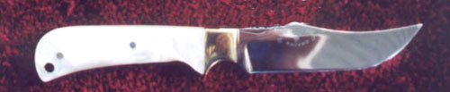 Stag Horn Hidden Tang handle, African Black wood spacers and triple black white spacers, 303 Butt Cap and guard, 440C blade. White pearl handle, Brass bolster, 1/2 file art work on 440C upturn blade, 1/4 stainless thonghole.