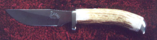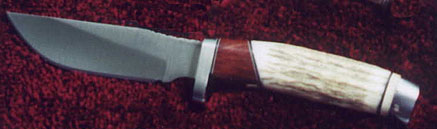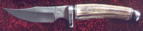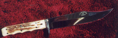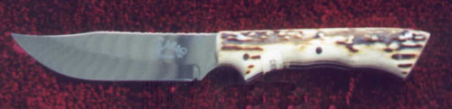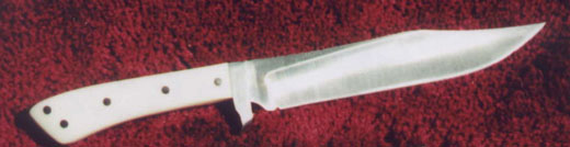 Click on any of the pictures below to view larger images.White Ivory Alternative Handled fighter, nickel silver guard, 5 large stainless pins, black and stainless spacer, down handle, 6 7/8" blade, 12" overall length, satin finish 440C blade, 1/4 file art work. Slant Thuyl Burlwood, Polish Elk Horn, white black white spacers on slant and double on back and front, 440C blade drop point, full file artwork down blade and #5 on Blade, 303 Stainless Butt Cap. Indian Sambar Stag, Bowie Knife, 440C stainless blade, mirror finish, 303 fingerguard, 13" overall, 7 3/4" blade