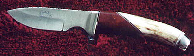 Thuyl Burlwood slant, polish elk horn handle, 440 C larger skinner blade, satin finish on blade, 1/4 file art work down blade, Mammoth Ivory spacer on 303 stainless butt cap. Full Tang, Sambar Indian Stag Handle, finger grip handle, 6 303 stainless pins, 3/4 file art work down 440C blade. Golden Elk horn handle, 2 triple spacers, 303 stainless guard and butt cap, big blade 440C, satin finish skinner.