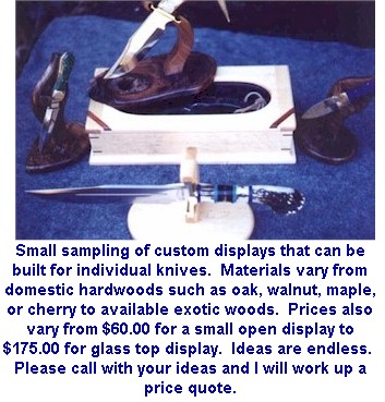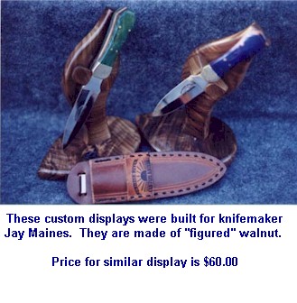 John believes that a fine handmade knife deserves the best. His displays are carefully chosen for figure and only the finest materials are used. These displays demonstrate his unusual design and classic styling. Click on images for larger view.